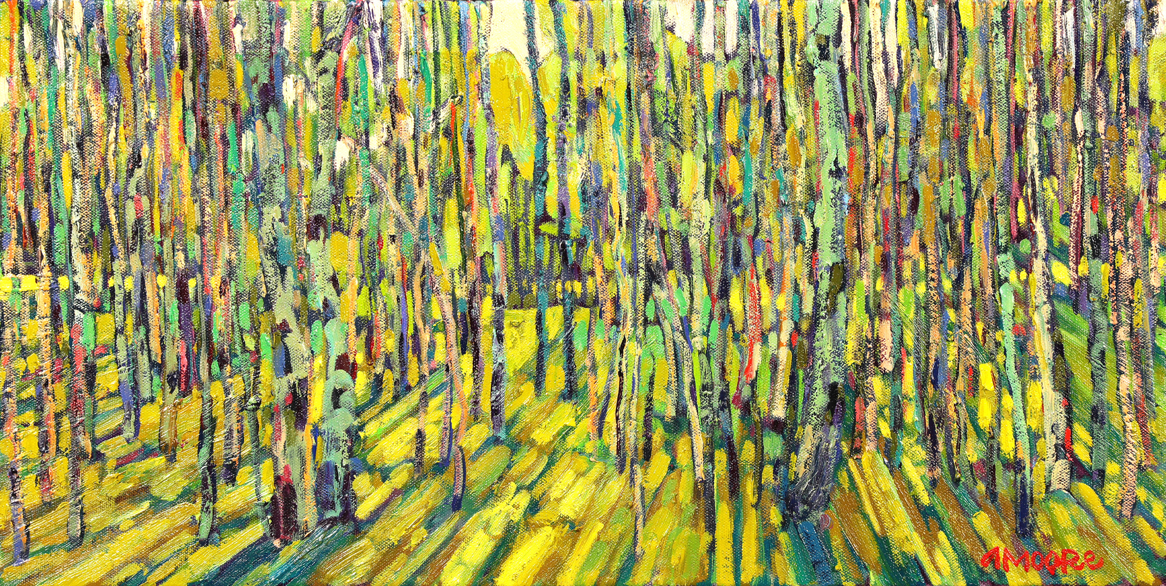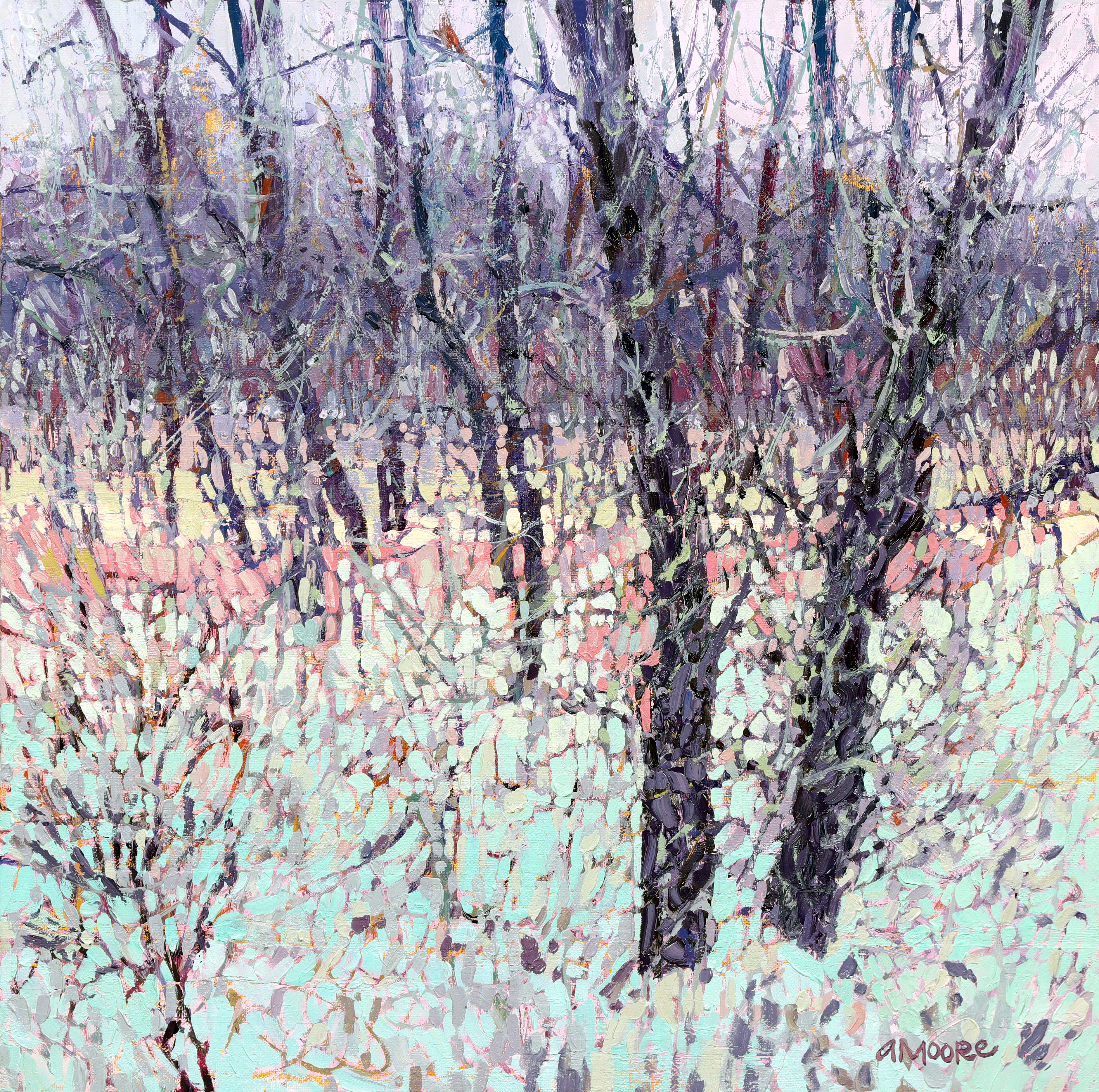 “I want my paintings to evoke an inspirational or uplifting feeling from any distance, as nature does. I love to look at my paintings up close and see the juxtaposition of even unexpected colors next to each other. I work layer on layer to produce these many small moments of color and texture.”