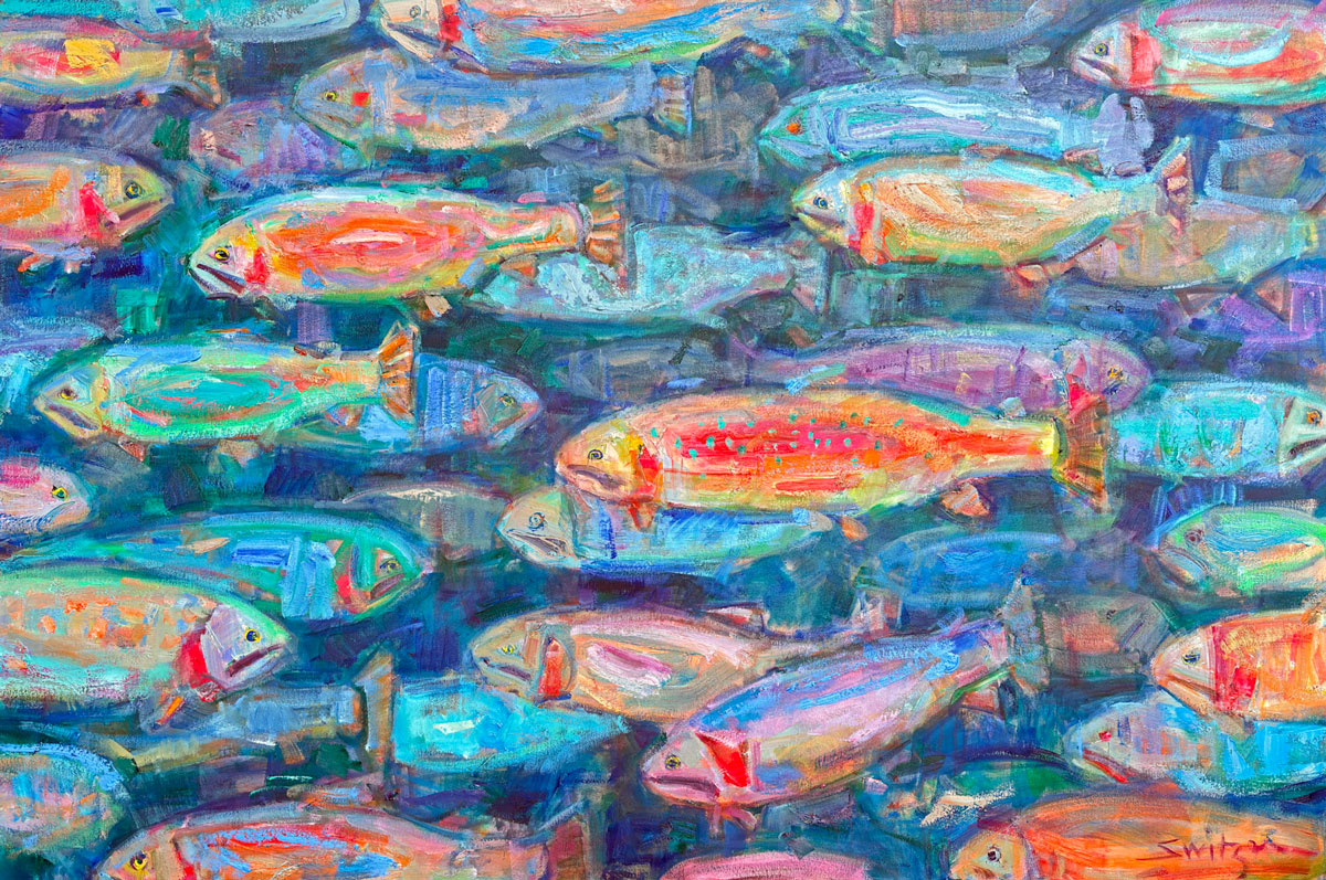 Over more than four decades, Switzer’s paintings have been exhibited in solo and group shows across the United States, including the Meyer Gallery (Santa Fe, NM), Turner Gallery (Denver, CO), Trailside Galleries (Scottsdale, AZ, and Jackson Hole, WY), Shoal Creek Gallery (Austin, TX), Artique Gallery (Anchorage, AK), Dana Gallery (Missoula, MT), Teilbaum Center for the Arts (Los Gatos, CA), Chase Family Gallery at the Mandell JCC (West Hartford, CT), Mockingbird Gallery and Peterson Contemporary Art (Bend, OR).